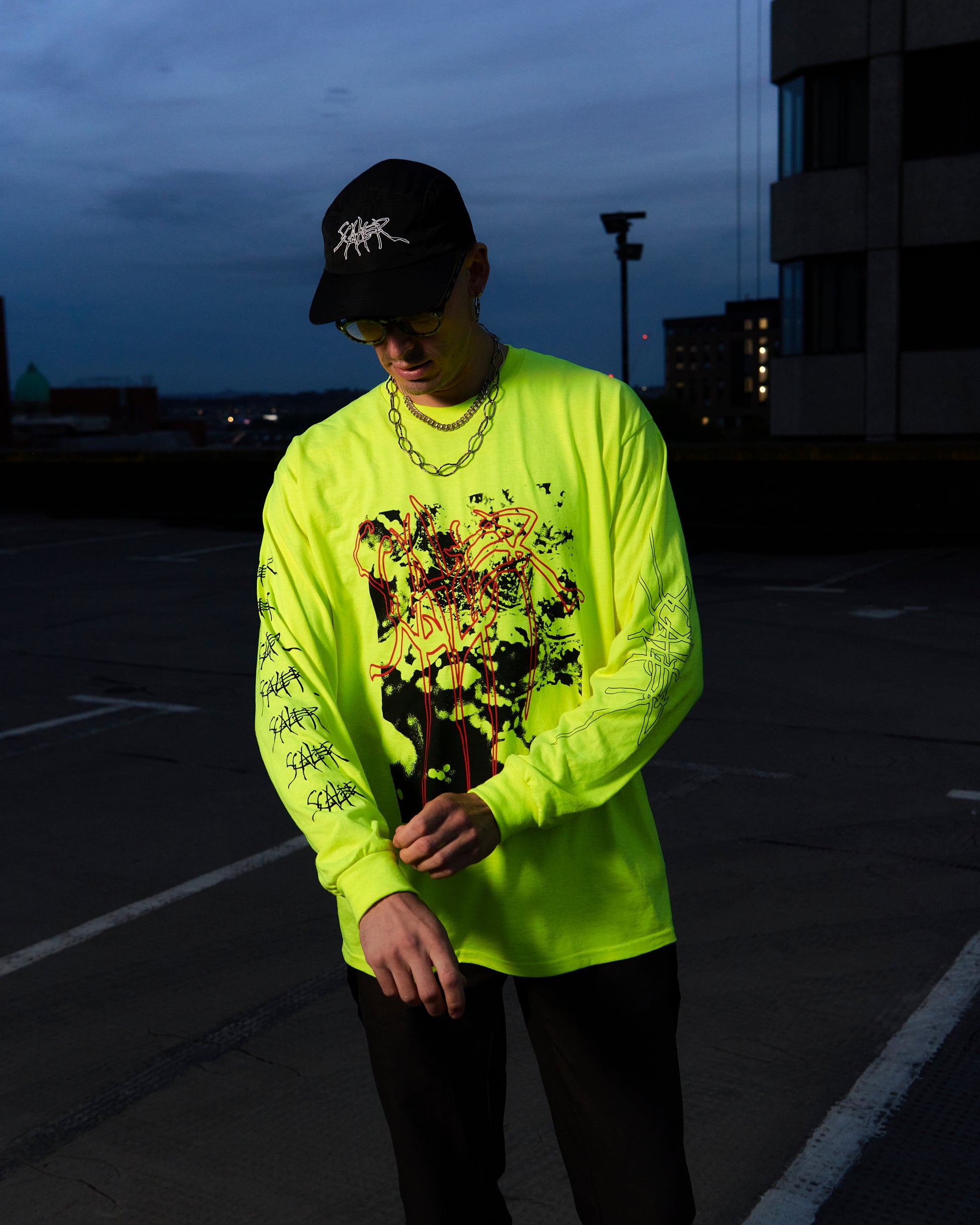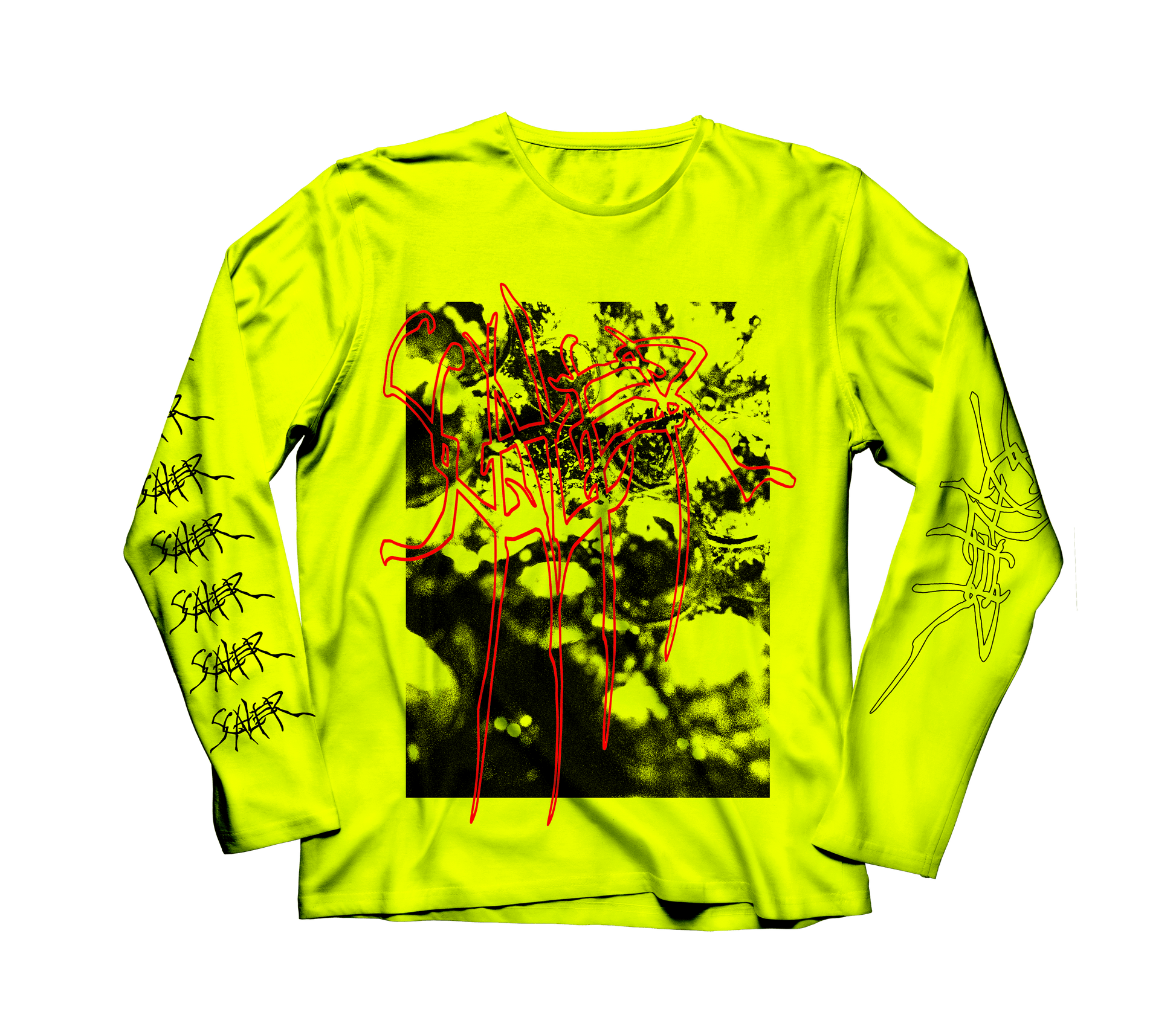 Safety Green longsleeve with oversized front print and double sleeve print.